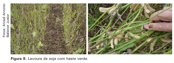 A retenção foliar e/ou haste verde da soja (Figura 9) é, quase sempre, consequência de distúrbios fisiológicos que interferem na formação ou no enchimento dos grãos. Entre esses, podem estar os danos por percevejos (Sosa-Gomez; Moscardi, 1995), o estresse hídrico (falta ou excesso) (Schapaugh; Roozeboom, 2012), o uso de certos fungicidas (Hill et al., 2013), o desequilíbrio nutricional das plantas (Mascarenhas et al., 1987) e a presença de poucas vagens na planta (Zhang et al., 2016).