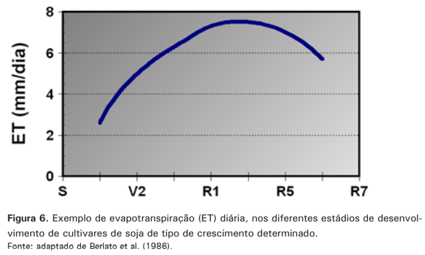 A cultura da soja necessita um volume total de água que varia entre 450 mm a 800 mm/ciclo. A necessidade de água é maior na medida em que ocorre o desenvolvimento da planta, atingindo o máximo durante a floração-enchimento de grãos, decrescendo após esse período (Figura 6). Além do estádio de desenvolvimento, o consumo de água pela cultura depende das características da cultivar, do manejo e da demanda evaporativa da atmosfera, podendo assim, variar tanto em função das condições climáticas de cada região, quanto em função do ano e da época de semeadura na mesma região climática (Berlato et al., 1986; Bergamaschi et al., 1999).