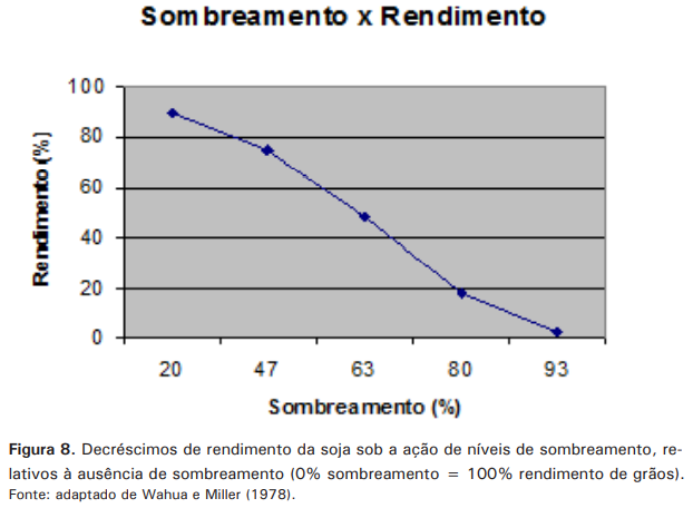 Na Figura 8 é possível verificar o efeito de níveis de sombreamento no decréscimo do rendimento da soja (Wahua; Miller, 1978).