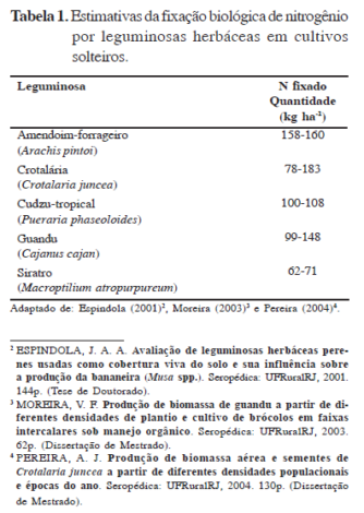 A quantidade de nitrogênio fixado varia de acordo com a espécie vegetal utilizada como adubo verde e com as condições edafoclimáticas, podendo chegar a mais de 100 kg de N por hectare (Tabela 1).
