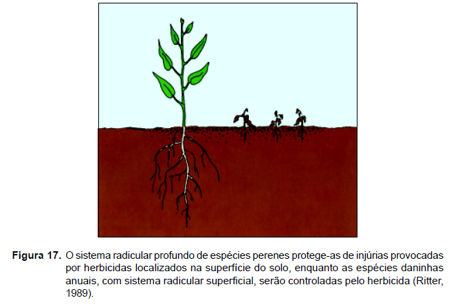 O estádio de desenvolvimento é outro fator importante no controle das plantas daninhas. As espécies anuais competem com as culturas perenes, mas são relativamente mais fáceis de serem controladas em virtude das diferenças entre os sistemas radiculares destas, especialmente quanto à sua distribuição, como ilustrado na Figura 17.