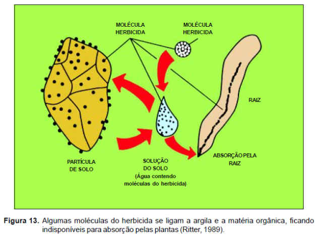 O solo é composto por diferentes quantidades de areia, silte e argila, além de ar, água e matéria orgânica. A argila e a matéria orgânica formam a fração coloidal do solo, que age como magneto (imã), aos quais as moléculas herbicidas se ligam (adsorção). Os solos com altos teores de matéria orgânica e/ou argila têm alta capacidade adsortiva. Após o esgotamento da capacidade adsortiva do solo, as moléculas herbicidas tornam-se disponíveis para a absorção pelas plantas.