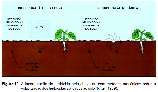 As perdas do herbicida por volatilização dependem do seu grau de volatilidade. Os produtos altamente voláteis apresentam recomendações específicas, como no caso do trifluralin, que deve ser imediatamente incorporado ao solo após a aplicação. A Figura 12 demonstra como a volatilidade pode ser reduzida pela incorporação do herbicida pela chuva ou por meios mecânicos.