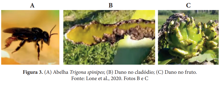 A abelha irapuá é uma das pragas mais danosas para a pitaya, causando buracos nos frutos que facilitam a entrada de patógenos.