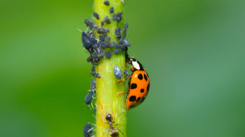 Os pulgões enfraquecem a planta ao sugar sua seiva, e as formigas os protegem em troca de secreções adocicadas.