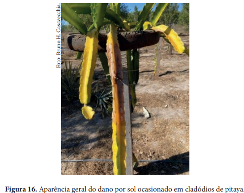 A pitaya é sensível à exposição solar excessiva, o que pode causar queimaduras nos caules e frutos, reduzindo a qualidade. Para mitigar, é essencial o sombreamento adequado e a manutenção de uma camada de proteção natural nas plantas.