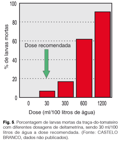 O nível de resistência de uma população de T. absoluta a um inseticida pode ser bastante elevado. Como exemplo, em avaliação realizada no Distrito Federal em 1999, foi constatado que era necessária uma dose de 1.200 ml/100 litros de água de Deltametrina para matar 90% das larvas de uma população de traça-do-tomateiro, enquanto a dose recomendada do produto, de 30 ml/100 litros de água, matava apenas 5% das larvas (Figura 5). Isso significava que o produto Deltametrina, na dose recomendada, era ineficiente para controlar a traça-do-tomateiro em campo. Os resultados dos testes de laboratório indicaram que, para matar no mínimo 90% das larvas do inseto em suas lavouras, os produtores da região avaliada deveriam empregar uma dose 40 vezes maior que a dose recomendada, o que seria inviável do ponto de vista econômico e ambiental.