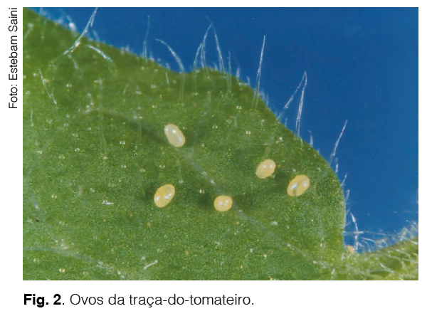 Os ovos são colocados individualmente nas folhas (Figura 2), principalmente nas folhas do terço superior da planta, mas também podem ser encontrados nas hastes, flores e frutos. Apresentam formato elíptico e coloração amarelada, passando a marrom-escuro quando próximos à eclosão, que ocorre três a cinco dias após a postura. O número médio de ovos por fêmea é de 55,2 (COELHO et al., 1984; COELHO; FRANÇA, 1987; HAJI et al., 1988a, 1988b).
