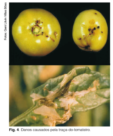 As lagartas formam galerias (minas) transparentes nas folhas e se alimentam no interior destas. Atacam também o caule, formando minas, e os frutos, formando galerias; nos locais de ataque observam-se fezes escuras (SOUZA; REIS, 1992) (Figura 4). Em ataques severos, podem destruir completamente as folhas do tomateiro, ocorrendo um secamento dos folíolos e a consequente morte da planta. Os frutos danificados ficam impróprios para comercialização, além de facilitar a contaminação por patógenos (fungos e bactérias). As plantas ficam com sua capacidade de produção reduzida, havendo queda de frutos atacados e maturação forçada dos que permanecem.