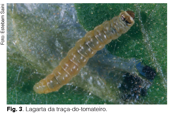 As lagartas (o estágio da praga que ocasiona danos) medem cerca de 6 a 9 mm de comprimento, apresentam coloração inicial branca tornando-se, posteriormente, verde-arroxeadas (Figura 3) e são caracterizadas pela placa protoráxica preta, em forma de “meia lua”. Logo após a eclosão, penetram no parênquima foliar, nos frutos ou nos ápices das hastes, onde permanecem de oito a dez dias, quando se transformam em pupas.