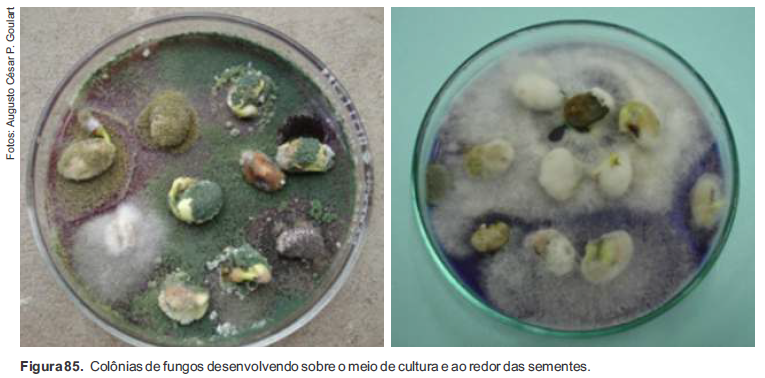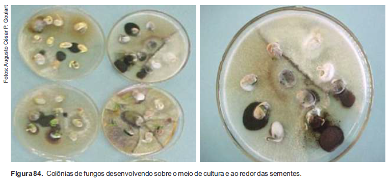 d) Avaliação/exame das sementes – Após o período de incubação, a avaliação é realizada a olho nu, baseando-se nas características das colônias que se desenvolvem sobre o meio de cultura e ao redor das sementes. Cor, textura, morfologia geral e a presença de corpos de frutificação podem auxiliar no reconhecimento das espécies fúngicas. Quando necessário, as sementes devem ser examinadas individualmente ao microscópio estereoscópico, para confirmação do diagnóstico.