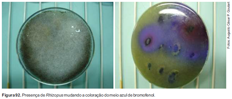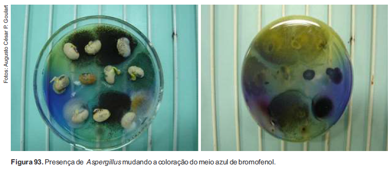 e) Este método é específico para detecção de S. sclerotiorum, porém algumas espécies de Rhizopus (Figura 92), Aspergillus (Figura 93) e Sclerotium também podem também provocar alteração da cor do meio. Nesses casos, a formação de frutificações típicas dessas espécies pode ser facilmente distinguida de Sclerotinia.