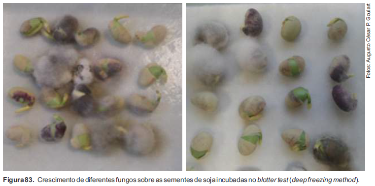b) Procedimentos – Este método consiste em pequena variação do anterior, no qual elimina-se a germinação, não pelo uso do 2,4-D mas pela exposição das sementes à temperatura de -20 °C. As sementes de soja são semeadas em caixas Gerbox contendo três folhas de papel de filtro previamente esterilizadas e embebidas em ágar diluído (10 g de ágar/1.000 ml de água) para facilitar a fixação das sementes no substrato. As sementes são dispostas em número de 20, por recipiente (Figura 83). Os resultados devem ser expressos em percentual de ocorrência dos fungos.