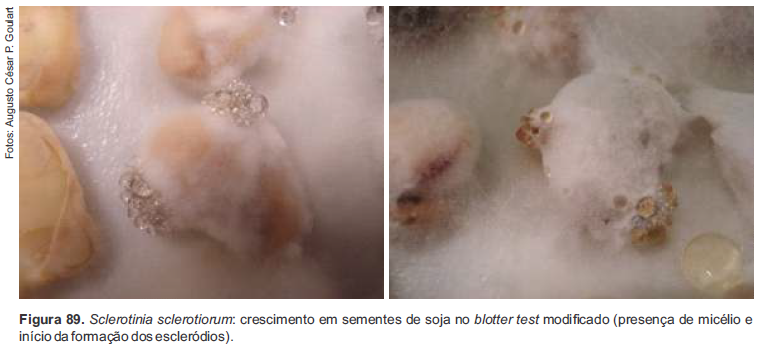 d) Avaliação/exame das sementes – Após o período de incubação, as sementes são examinadas, uma a uma, a olho nu, sendo que a identificação é feita com base na presença de micélio tipicamente branco de S. sclerotiorum com formação de escleródios negros, de forma esférica, irregulares e tamanho de 2 mm a 10 mm, ao redor das sementes infectadas (Figuras 88 e 89).