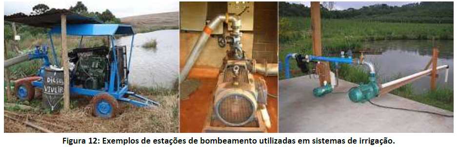 A partir de uma fonte de água, que pode ser de origem superficial (rio, lagoa, barragens, etc.) ou subterrânea (poços), é necessária a utilização de bombas de recalque para elevar a água da fonte até a área a ser irrigada.