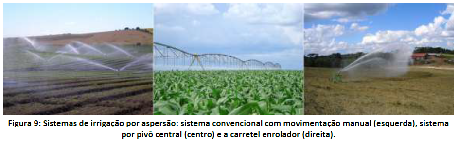 Os sistemas de irrigação por aspersão convencional e mecanizada estão exemplificados na Figura 9.