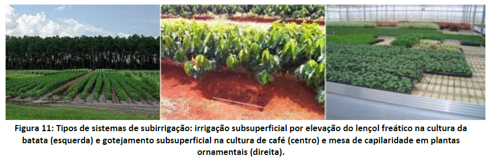 - Subsuperfície ou subterrânea: a água é aplicada abaixo da superfície do solo, dentro do volume explorado pelas raízes das plantas.
