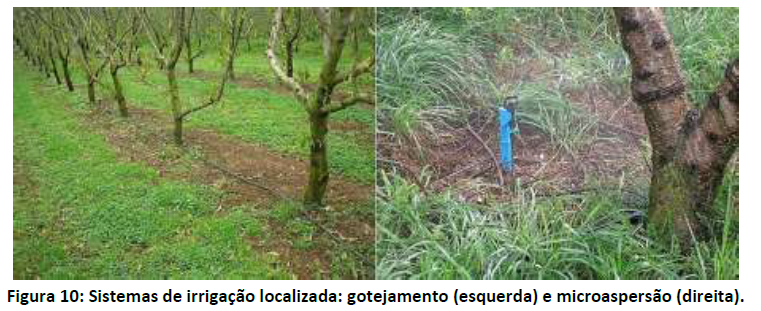 A Figura 10 apresenta os dois tipos de sistemas de irrigação localizada, onde se observa a diferença na área e no local de aplicação de água dos sistemas (abaixo da copa das árvores).