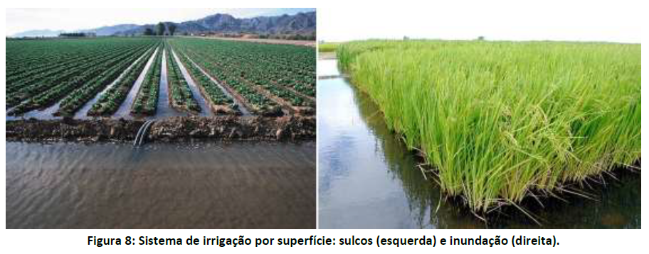 A Figura 8 ilustra os sistemas de irrigação por sulcos e por inundação pertencentes ao método de irrigação por superfície, enfatizando a diferença entre os sistemas.