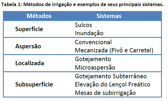 A Tabela 1 relaciona de forma didática os quatro métodos de irrigação com os seus principais sistemas de operação.