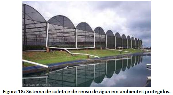 A Figura 18 mostra um sistema de coleta de água de chuvas que será misturada com a água descartada da irrigação, sendo posteriormente tratada e retornada ao sistema de produção.