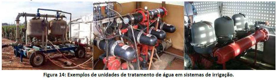 Estas unidades são constituídas principalmente de filtros de areia, de tela ou disco. A Figura 14 exemplifica o uso desses filtros que, além de proteger os emissores, possuem a função de reduzir os danos causados por sedimentos nas tubulações e acessórios dos sistemas.