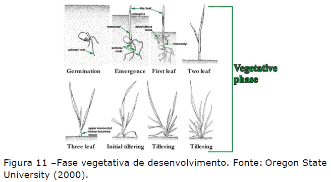 1. Fase vegetativa: Inicia-se na germinação da semente e emergência da plântula. A seguir, a planta passa pelas fases de desenvolvimento da área foliar e perfilhamento.