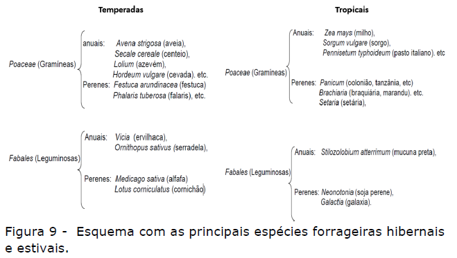 a) Hibernais: São forrageiras de clima temperado, de dias menos ensolarados, geralmente de pequeno crescimento, caules finos e folhagem tenra. São semeados no outono (tanto as perenes como as anuais), sendo utilizadas durante o inverno e também na primavera.
