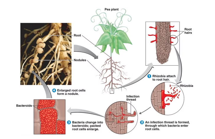 Esse processo é realizado por microrganismos diazotróficos, sendo os mais conhecidos as bactérias do gênero Rhizobium, que estabelecem uma relação simbiótica com plantas leguminosas (como soja, feijão, amendoim, alfafa, entre outras).