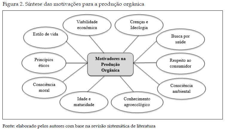 A análise dos estudos prévios permitiu identificar que as motivações para a adoção da agricultura orgânica envolvem principalmente questões pessoais, organizacionais e econômicas. Nesse sentido, primeiramente, identifica-se que a produção orgânica advém de ideologias, princípios e valores dos produtores que buscam contribuir para a melhoria do meio ambiente e da sociedade. A agricultura orgânica tem crescido como resposta à consciência ambiental devido ao impacto positivo no meio ambiente (LÄPPLE, RENSBURG, 2011). Além disso, aspectos como idade (agricultores mais velhos estão mais propenso à adoção) (KARKI et al. 2011), estado civil dos agricultores e produtividade da fazenda (quanto maior, mais disposição para adoção) (JOUZI et al., 2017) são aspectos pessoais que motivam a adoção da agricultura orgânica. Ademais, a atitude para a agricultura orgânica envolve preocupação com a saúde (KARKI et al., 2011), consciência ambiental (SUTHERLAND, 2013) e consciência moral (MZOUGHI, 2011). Aqui se destaca particularmente a concepção idealista dos produtores, que envolve uma orientação filosófica em relação à preservação da natureza (SCALCO et al., 2015).