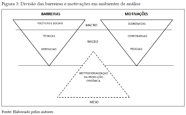 A análise integrada dos estudos permite identificar ainda que a compreensão das barreiras e das motivações na produção de orgânicos passa por três níveis distintos de análise: nível microssocial, relacionado ao aspecto humano, gerencial e técnico da produção de orgânicos e o nível macrossocial, que aborda aspectos mais amplos, como influências políticas e sociais. No entanto, seguindo uma visão clássica das ciências sociais, entre estes dois níveis opera o nível mesossocial, ou seja, as inter-relações que formam o ambiente que institucionaliza as relações entre os atores de um sistema social. São as instituições que trazem a compreensão dos mercados tratando-os como campos organizacionais, onde ocorrem as tensões centrais entre as lógicas que os governam e a forma como ocorrem as relações comunitárias. A figura 3 apresenta as categorias de análise separadas por nível de ambiente.