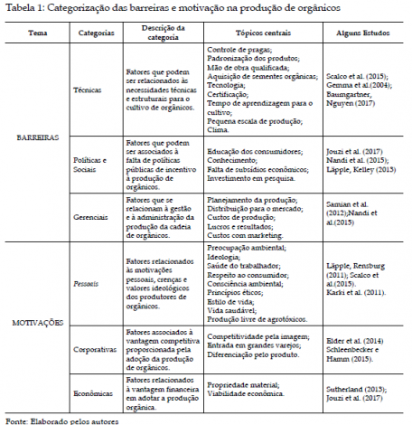 Tanto as barreiras quanto as motivações para a produção orgânica, identificadas na literatura, foram organizadas em categorias distintas. A tabela 1 separa as barreiras e as motivações em categorias, bem como, destaca os principais achados dos artigos em cada uma destas categorias.