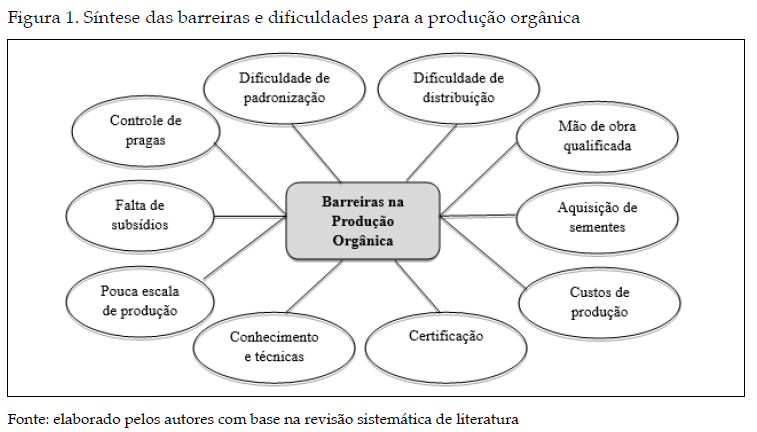 A análise da literatura com vistas à identificação de barreiras permitiu identificar aspectos ligados a dificuldades técnicas no cultivo, à falta de políticas claras de incentivo e a questões sociais enfrentadas pelos produtores. Outro aspecto identificado relacionasse a problemas na gestão da produção, no que diz respeito ao planejamento e às formas de distribuição dos produtos no mercado. As dificuldades técnicas destacam custos de produção e menor desempenho produtivo dos orgânicos em relação aos convencionais (ALTARAWNEH, 2016). As demais pesquisas apontam que as dificuldades no sistema de produção de alimentos orgânicos estão relacionadas a limitações técnicas, como a disponibilidade de sementes orgânicas, o controle de pragas que assolam as produções, a falta de informação em relação ao tipo de produtos permitidos e não permitidos para uso na agricultura orgânica e a falta de mão de obra qualificada (SCALCO et al., 2015; UEMATSU, MISHRA, 2012).