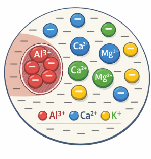 A saturação por alumínio é um índice químico que expressa a porcentagem da Capacidade de Troca de Cátions efetiva (t) que está ocupada pelo íon alumínio trocável (Al³⁺). Diferentemente de outros cátions, como Ca²⁺, Mg²⁺ e K⁺, que costumam ser interpretados em relação à CTC total a pH 7,0 (Valor T), o alumínio é analisado com base na CTC efetiva, que representa a condição real do solo no seu pH atual.