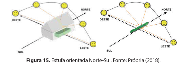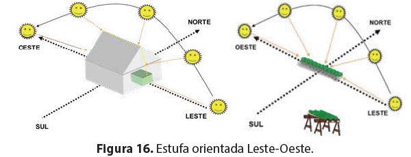 Em cultivos onde se deseja algum sombreamento durante a maior parte do dia deve-se utilizar o sentido Leste-Oeste (Figura 16), pois se promove o auto sombreamento.