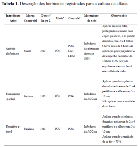 Algumas características referentes ao uso dos ingredientes ativos registrados para o controle de plantas daninhas na cultura da alface no Brasil e sua respectiva identificação comercial e observações relevantes de uso estão disponíveis na Tabela 1.