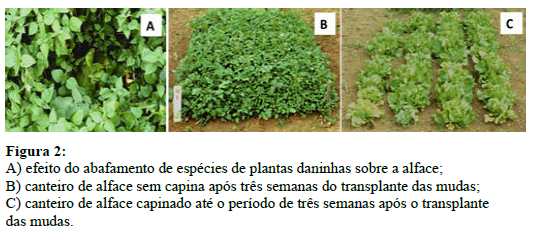 A cultura da alface, assim como outras olerícolas, é exigente em solos com altos níveis nutricionais e prefere solos com altos teores de matéria orgânica. Esta condição favorece a incidência de uma alta densidade populacional das plantas daninhas que, em relação à cultura, apresentam grande capacidade competitiva. Há relatos da perda de 100% na produção da cultura de alface vegetando com uma infestação de 65 a 135 plantas daninhas por m2. A cultura mantida “no limpo” por três semanas é tempo suficiente para não prejudicar significativamente a produção (Figs. 2A, B, C).