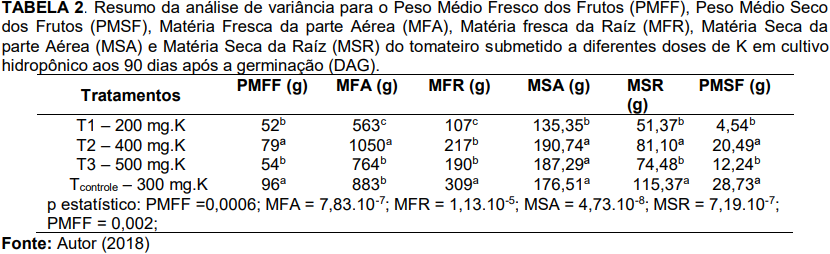 Pacheco (2017), avaliando MSR, MFR, MSA e MFA em tomates cereja sob disponibilidades hídricas e doses de potássio com irrigação semiautomatizada em ambiente protegido, observou diferença significativa isolada para as doses de potássio, com incremento de 54% para a dose de 500 mg.dm-3 . Melo et al., (2014) no entanto não constataram diferença estatística para MSA em tomateiros cultivados com variação de doses de potássio e nitrogênio em sistema hidropônico. Da mesma forma Kalungu (2008), avaliando respostas de tomateiro a diferentes lâminas de irrigação, doses de potássio e cobertura de solo em ambientes protegidos, não assistiram diferença estatística para massa seca da parte aérea para nenhuma das interações. Exceto Pacheco (2017), ambos os autores diferiram dos resultados aqui expostos, cujas doses de 400, 500 e 300 mg.K foram superiores, estatisticamente à dose de 200 mg.K. Essa divergência pode estar embasada no fato de que os referidos autores utilizaram uma concentração de K inferior ao da metodologia aqui executada. Para a variável PMSF e PMFF, Genúncio et al., (2006) relataram incremento na variedade de tomate UC-82 cultivada em sistema hidropônico com aumento da concentração iônica da solução nutritiva. Fernandes et al., (2002) não constatou diferença significativa para PMFF e PMSF estudando produtividade e qualidade de frutos do tomateiro submetido a diferentes fontes de potássio, atingindo média de 154,7 g. A diferenciação estatística para as vaiáveis MSA, MSR, MFA, MFR, PMSF e PMFF evidenciadas nesse projeto podem estar relacionadas à elevada concentração de K na solução nutritiva e sua função metabólica, que exerce eficiência de uso da água, em consequência do controle de abertura e fechamento dos estômatos, maior translocação de carboidratos produzidos nas folhas para outros órgãos da planta e melhoria da qualidade comercial da planta. Além disso, Em níveis adequados de K observa-se aumento da produção e principalmente a melhoria da qualidade comercial dos frutos (TAIZ e ZEIGER, 2009).
