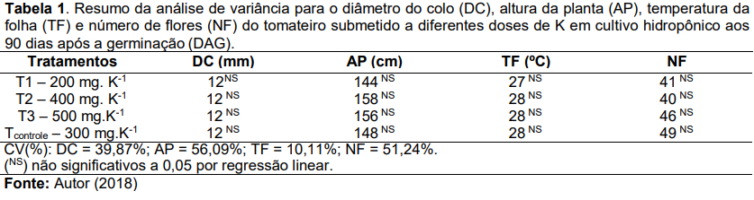 O aumento do cultivo do tomate (Lycopersicum esculentum Mill) fomenta tecnologias para o manejo de cultivo, garantindo elevadas produtividades e reforçando sua influência. O potássio (K) é um dos nutrientes mais demandados pelo tomateiro, sendo responsável pela translocação de solutos e regulação de abertura e fechamento dos estômatos. Objetivou-se avaliar o crescimento e desenvolvimento vegetativo do tomateiro cultivado em sistema hidropônico com variação de mg em doses de K. Os tratamentos foram: 200 mg.L-1 ; 400 mg.L-1 ; 500 mg.L-1 e 300 mg.L-1 de K, sendo este último a testemunha. O delineamento experimental foi de blocos casualizados (DBC) com cinco blocos e quatro repetições. As variáveis diâmetro do colo (DC), altura da planta (AP), temperatura da folha (TF) e número de flores (NF), foram mensuradas com intervalo de sete dias até os 90 dias após a germinação. Os resultados foram submetidos à análise de variância a 5% de probabilidade, sendo comparados por Regressão Linear.