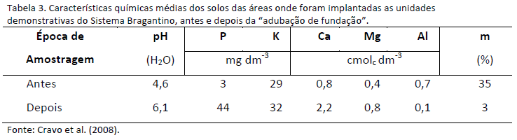 Como os solos da região Nordeste do Pará são de baixa fertilidade natural e encontram-se degradados, em sua maioria, há necessidade de ser feita a recuperação da fertilidade, por meio da adubação de fundação, para a implantação do Sistema Bragantino. Assim sendo, áreas antes consideradas degradadas tiveram a fertilidade do solo restaurada (Tabela 3), dando condições de serem reintroduzidas ao processo produtivo, de forma contínua e por tempo indeterminado.