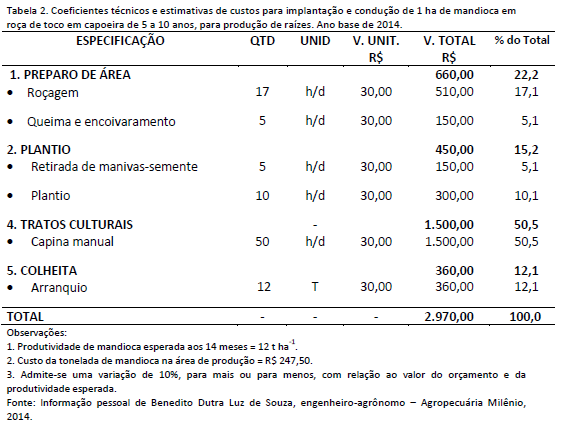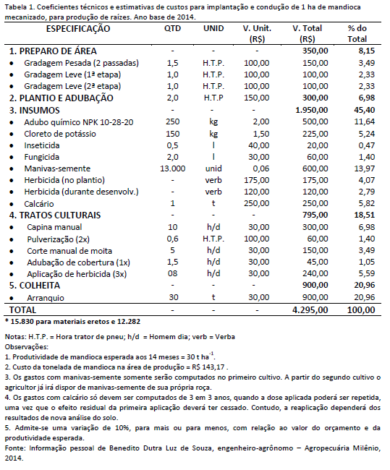 Os coeficientes técnicos e estimativas de custos, para a implantação totalmente mecanizada de 1 ha de mandioca, podem ser vistos na Tabela 1 e comparados com a implantação, também de 1 ha, em roça de toco (Tabela 2). As estimativas de retorno econômico, em ambos os casos, são feitas tomando-se como base a venda de raízes para a agroindústria, sem transformar em farinha ou outros subprodutos da mandioca.