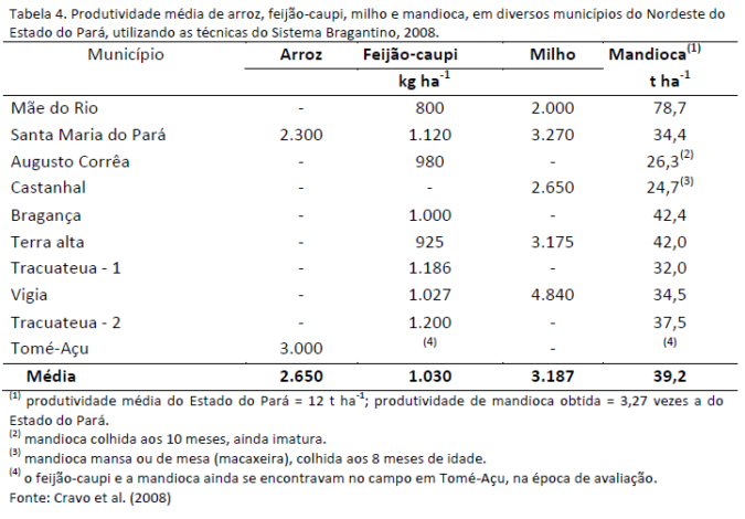Diversos testes de uso desse sistema na região mostram resultados extraordinários, em termos de melhoria da fertilidade do solo, após a “adubação de fundação” (Tabela 3) e da produtividade das culturas de arroz, milho, feijão-caupi e mandioca (Tabela 4), o que demonstra a viabilidade de uso do sistema na região e a possibilidade de reintegração de áreas já alteradas ao processo produtivo, com baixo impacto ambiental (CRAVO et al., 2008). Vale ressaltar que a produtividade média de arroz e milho no sistema de derruba-e-queima na região gira em torno de 500 kg ha-1, a de feijão-caupi 800 kg ha-1 e da mandioca 12 t ha-1. Assim, o aumento da produtividade de arroz foi de 430%, a do feijão-caupi foi de 28,75%, a do milho foi de 537,4% e a da mandioca foi de 226,7%, o que qualifica o Sistema Bragantino como de alta viabilidade agronômica e econômica.