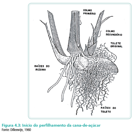 Depois de determinado estádio de desenvolvimento, as gemas localizadas na base do colmo primário se intumescem. Aproximadamente 20 a 30 dias após a brotação inicial do colmo primário, observam-se novos brotos emergidos. Como essas novas brotações (duas ou mais) originaram-se do broto ou colmo primário, denominam-se colmos secundários. Nesse estádio inicia-se o perfilhamento.