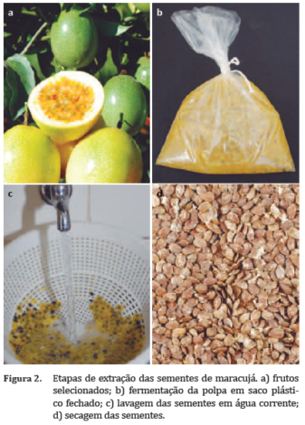 Em seguida, após os frutos serem cortados e a polpa retirada, deve-se colocar as sementes em um recipiente de vidro ou saco plástico, para fermentar, por um período de 3-5 dias, o que facilita a separação das sementes da polpa (Figura 2a, b). Na sequência, as sementes devem ser colocadas em uma peneira, lavadas em água corrente e secas à sombra por aproximadamente 48 horas, em camadas finas, sobre folhas de papel (Figuras 2c, d).