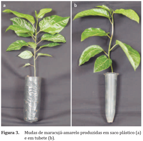 As mudas podem ser preparadas em saco plástico preto (9,0 cm x 18,0 cm) ou tubete (3,5 cm x 14,0 cm) (Figura 3). Para a produção de mudas mais desenvolvidas, recomenda-se a utilização de sacos plásticos de 15 cm x 25 cm, com volume de aproximadamente 1,0-1,5 kg de substrato. Para enchimento dos recipientes utilizados na produção das mudas podem ser utilizados dois tipos de substrato: