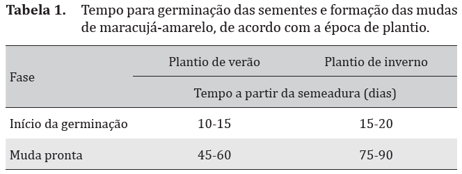 Dependendo da época de plantio, o preparo da muda apresenta tempo de formação e cuidados diferenciados, principalmente em função de diferenças na temperatura ambiente. Assim, mudas para plantio no final do inverno ou no início da primavera devem ser formadas em ambiente protegido do frio e semeadas com a maior antecedência da data prevista para o plantio, pois podem levar até 90 dias para atingir o desenvolvimento adequado para o plantio. Já as mudas para plantio no verão podem ser preparadas com menor antecedência, pois atingem desenvolvimento adequado em 45-60 dias (Tabela 1).