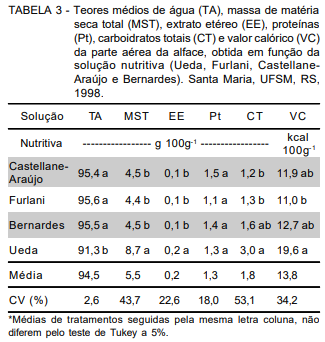 A solução Ueda apresentou menor teor de água, maior teor de extrato etéreo, maior teor de carboidratos totais, não diferindo da solução Bernardes e maior valor calórico, não diferindo das soluções Castellane-Araújo e Bernardes, mantendo semelhança as demais soluções quanto ao teor de proteína (TABELA 3). As plantas apresentaram aspecto coriáceo, crescimento lento e alta formação de látex, o que pode ser devido a deficiência nutricional múltipla.