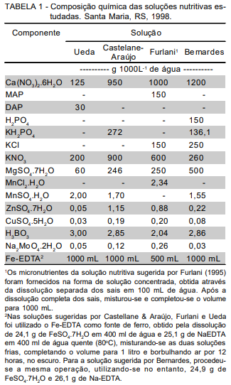 Os tratamentos constaram da combinação de seis cultivares de alface, sendo três do tipo folha lisa (Aurora, Lívia e Regina) e três do tipo folha crespa (Brisa, Mimosa e Verônica) e quatro soluções nutritivas: Ueda (Ueda, 1990), Furlani (Furlani, 1995), Castellane-Araújo (Castellane & Araújo, 1995) e Bernardes (Bernardes, 1997), constituindo um fatorial 6x4. A composição química das soluções nutritivas testadas constam na TABELA 1. O delineamento experimental foi o inteiramente casualizado em parcelas subdivididas, com duas repetições e amostragens na subparcela.