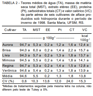 Os cultivares não diferiram quanto ao teor de água da parte aérea, apresentando teor médio de 94,46% aos 68 dias após a semeadura (TABELA 2). Esse valor foi semelhante aos citados por Oliveira & Marchine (1998) e Sgarbieri (1987) para alface cultivada no solo, os quais foram 94,85 e 94,0%, respectivamente. Em alface hidropônica Mondin (1996) encontrou teores inferiores, 92,7 e 92,1% aos 79 e 93 dias após a semeadura, respectivamente. Já Ruschel (1998) aos 47 dias após a semeadura, com 17 dias na bancada de produção, encontrou teor médio de 96,04%. Essa variação no teor de água se deve, provavelmente ao tempo de permanência das plantas de alface na fase final, sendo que, quanto maior esse período maior o acúmulo de massa de matéria seca e, com isso menor o teor de água.