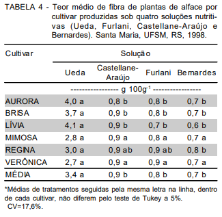 Os cultivares estudados acumularam diferentes teores de fibra na parte aérea em função da solução nutritiva utilizada (TABELA 4). A solução Ueda (1990) foi a que apresentou maiores teores de fibra, diferindo significativamente (a=5%) das demais para os cultivares Aurora, Brisa e Lívia, diferindo também da solução Bernardes para o cultivar Regina. Os valores médios encontrados para cada solução foram 0,88; 0,83; 0,73 e 3,39 g 100g-1, respectivamente para Castellane-Araújo, Furlani, Bernardes e Ueda. O alto teor encontrado na solução Ueda se deve ao alto acúmulo de massa de matéria seca, devido a sua baixa concentração de sais e também ao seu crescimento reduzido. Oliveira (1998) e Sgarbieri (1987) citam 0,6 e 0,7 g 100g-1 como teores médios para alface produzidas no solo. Percebe-se que a alface hidropônica tende a ter maior teor de fibra que a produzida no solo, isso se deve, provavelmente ao aumento no tamanho das folhas quando produzidas por esse sistema em casa-de-vegetação.